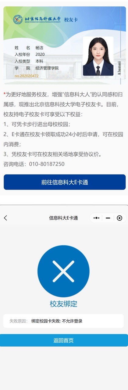 您好,打扰啦,我是2024届经济管理学院会计学的毕业生,计划于下周三返校,在申请校友卡时发现,无法打开信息科大E卡通进行充值,请问应该如何解决。从图中可以看出,校友卡申领成功,但打开E卡通失败。